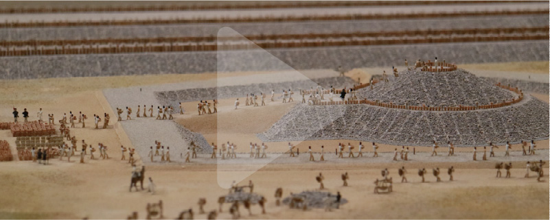 An introduction to the era of the Mozu-Furuichi Kofun Group, in which the largest mounded tombs were constructed, via the exhibition room diorama of Nintoku-tenno-ryo Kofun.